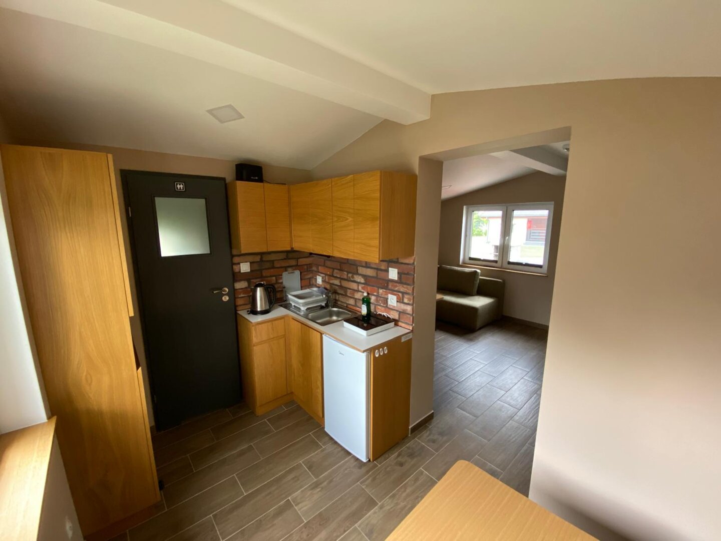 W skład wyposażenia aneksu kuchennego wchodzi lodówka, kuchenka mikrofalowa, płyta grzewcza, czajnik oraz zestaw naczyń do przygotowania posiłku. Każdy domek posiada taras wyposażony w grill oraz stół z ławkami.