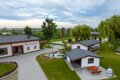 W skład wyposażenia aneksu kuchennego wchodzi lodówka, kuchenka mikrofalowa, płyta grzewcza, czajnik oraz zestaw naczyń do przygotowania posiłku. Każdy domek posiada taras wyposażony w grill oraz stół z ławkami.