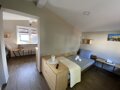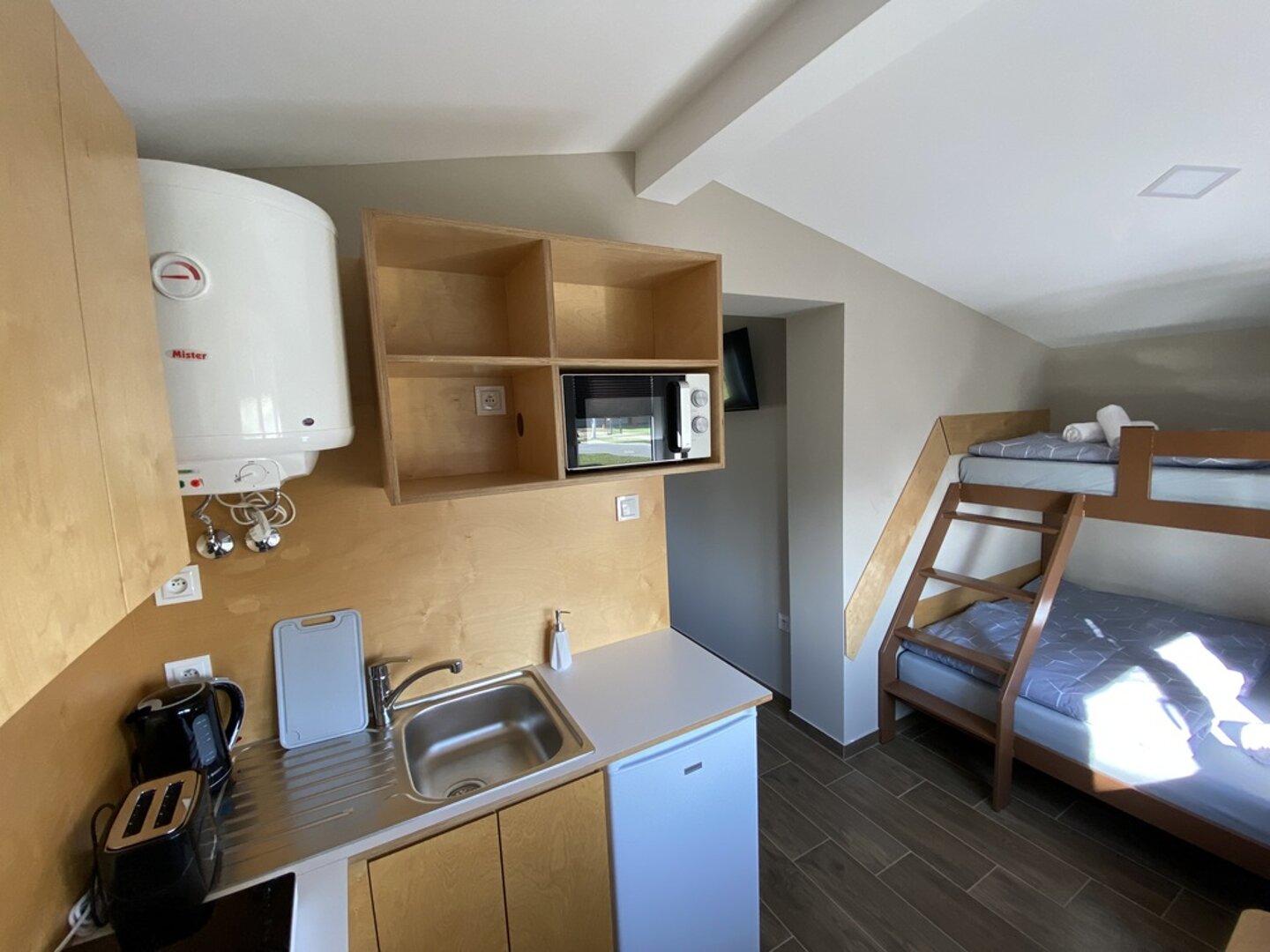 W skład wyposażenia aneksu kuchennego wchodzi lodówka, kuchenka mikrofalowa, płyta grzewcza, czajnik oraz zestaw naczyń do przygotowania posiłku. Każdy domek posiada taras wyposażony w grill oraz stół z ławkami.